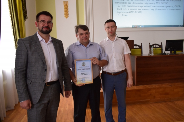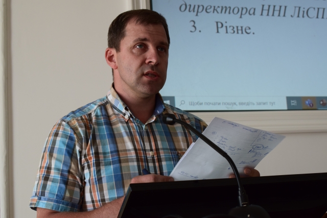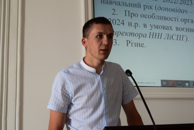 Одним із ключових та центральних питань порядку денного було представлення звіту директора інституту про діяльності ННІ лісового і садово-паркового господарства за 2022/2023 навчальний рік. Роман Василишин відзначив, що попри досить складний рік колективу ННІ ЛіСПГ вдалося не лише зберегти свої здобутки, але й покращити окремі показники діяльності. Він зупинився на основних показниках, наявних проблемах і шляхах їх вирішення в умовах військового стану. Особлива увага була приділена аналізу цьогорічної вступній кампанії щодо набору студентів на ОС «Бакалавр» і ОС «Магістр». При цьому детально зупинився на якісній профорієнтаційній роботі кожного співробітника, результатах публікаційної активності працівників інституту та основних організаційних заходах та завданнях на 2024 н. р. Також директор зосередив увагу на потужній матеріально-технічній базі інституту, яка постійно оновлюється. Наголосив, що запорукою майбутнього успіху є якісне навчання, відбір мотивованих студентів, спільна наукова, практична та міжнародна діяльність. На завершення свого виступу Роман Василишин побажав успіхів та процвітання в освітньому процесі, подякував за плідну роботу та високий професіоналізм колективу ННІ ЛіСПГ.