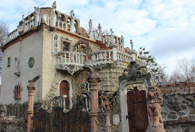 Є «італійський» дворик, кузня. На подвір'ї розташовано безліч різних деталей — брили різних каменів й безліч великих і малих скульптур, що ще не знайшли свого місця в композиції. Будинок має оригінальне оздоблення не тільки зовні, а й всередині.
