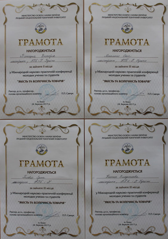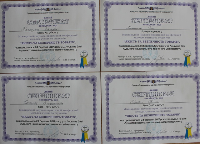 24-25 березня 2017 р. студенти магістратури факультету харчових технологій та управління якістю продукції АПК разом з наставником доцентом кафедри стандартизації та сертифікації с-г продукції Юлією Сливою прийняли участь в роботі Міжнародної науково-практичної конференції "Якість та безпечність товарів", яку організував Луцький національний технічний університет.