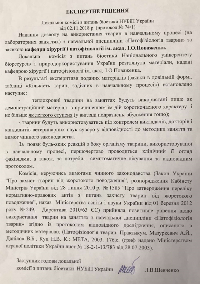 Висновок цієї Комісії щодо відповідності дотримання норм і правил згідно існуючого законодавства при використанні тварин під час освітнього процесу на факультеті ветеринарної медицини нашого університету додається.
