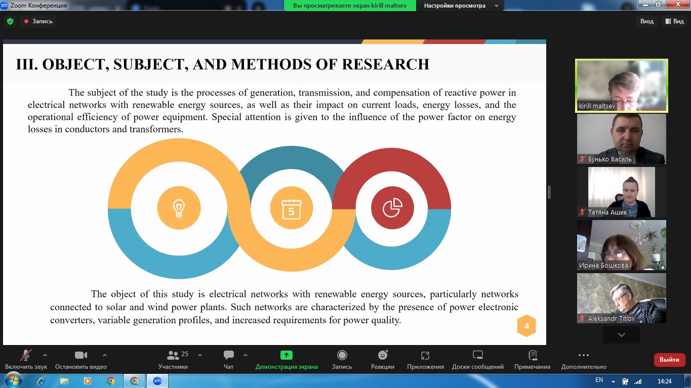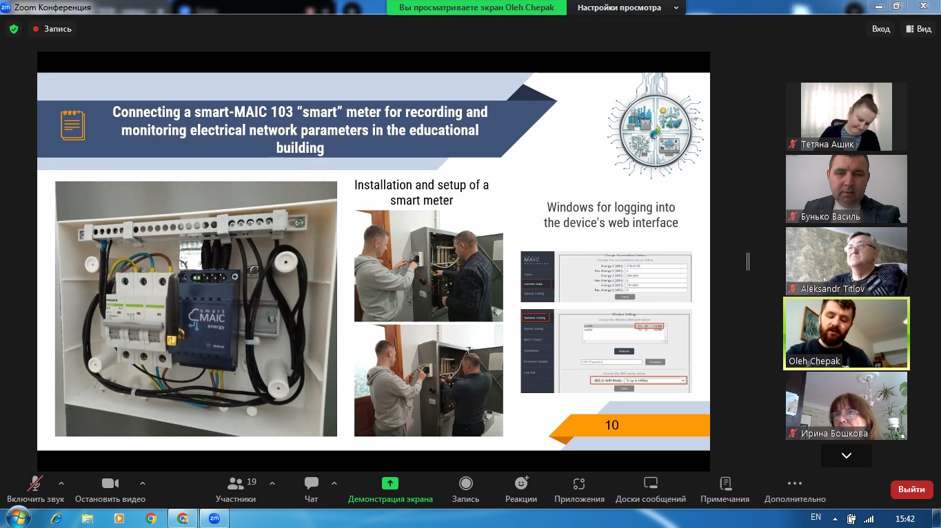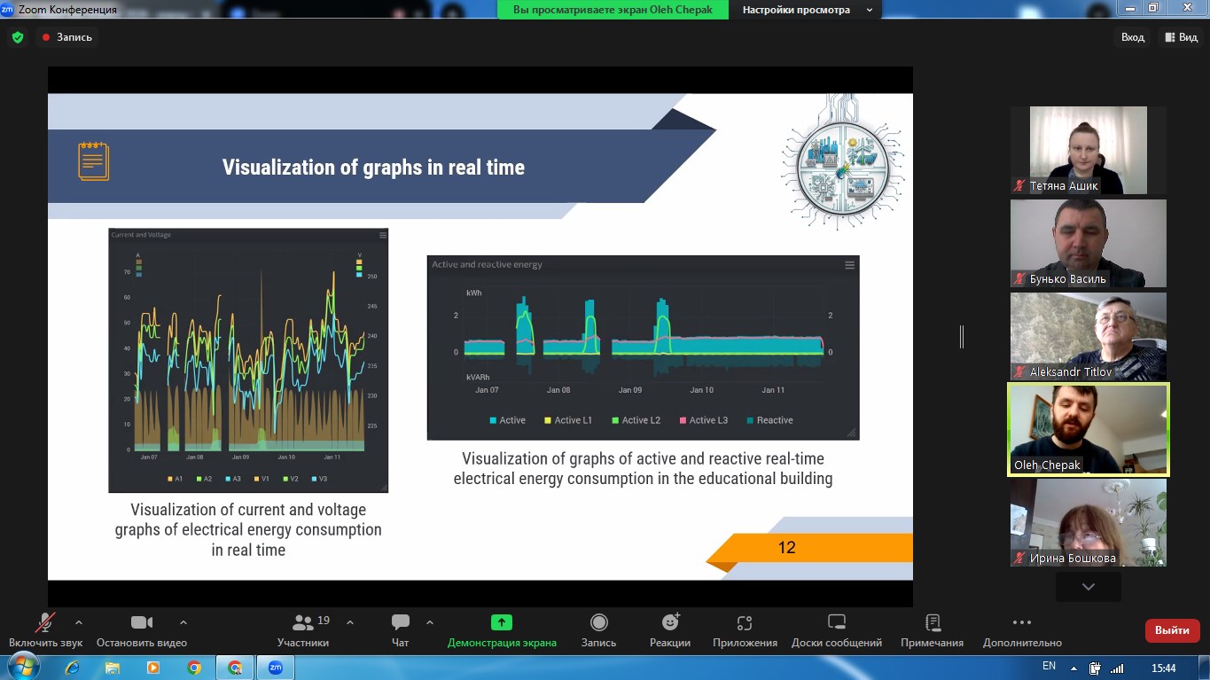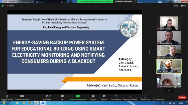 Наша команда представляла наукову роботу на тему «Енергоощадна система резервного живлення навчального корпусу з використанням Smart-моніторингу електроенергії та оповіщення споживачів під час блекауту», яка за результатами відбіркового етапу була включена до числа найкращих — серед 58 поданих робіт та рекомендована до участі у ІІ етапі конкурсу.