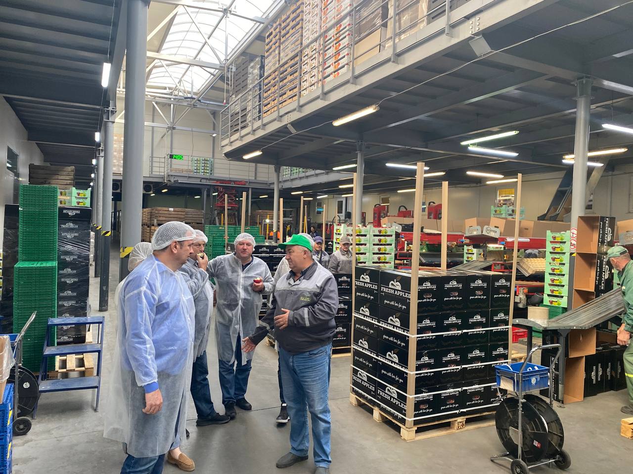 2. Фруктовий сад: інтенсивність європейського рівня. Наступною локацією візиту робочої групи стало серцем комплексу — фруктовий сад, де понад 1000 гектарів яблунь керуються за принципами «розумної» агрономії. Це територія європейської якості, де використовується комп’ютеризована система крапельного зрошення. Делегація була вражена масштабами зберігання — сучасні холодильні комплекси (до 26 тис. тонн) використовують інженерну думку для збереження свіжості плодів. Наявність власних цехів глибокої переробки дозволяє студентам вивчати повний цикл: від плодового саджанця до високоякісного соку чи чипсів.
