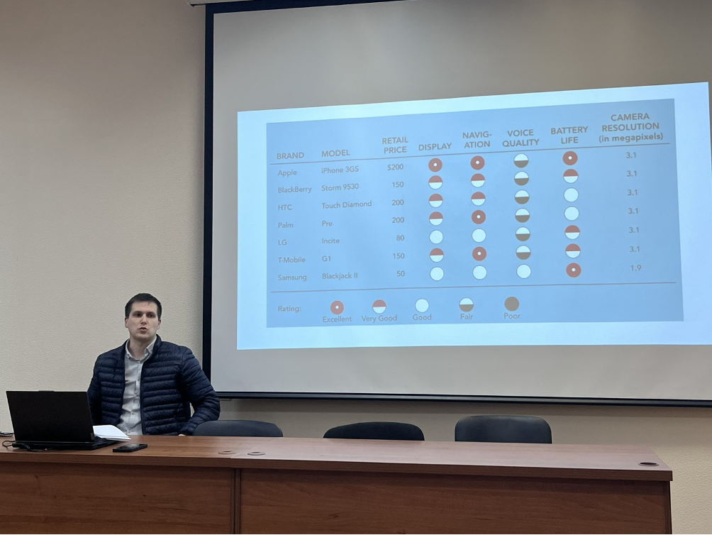 Під час лекції Тимофій Андрійович детально розкрив основні етапи процесу прийняття споживачем рішення про покупку: від усвідомлення потреби — до оцінювання альтернатив, здійснення вибору та посткупівельної поведінки. Особливу увагу було приділено психологічним факторам, які часто непомітно впливають на вибір: сприйняттю, мотивації, ставленням, рівню залученості та навіть підсвідомим тригерам, які формують враження про товар.