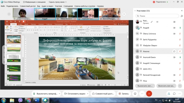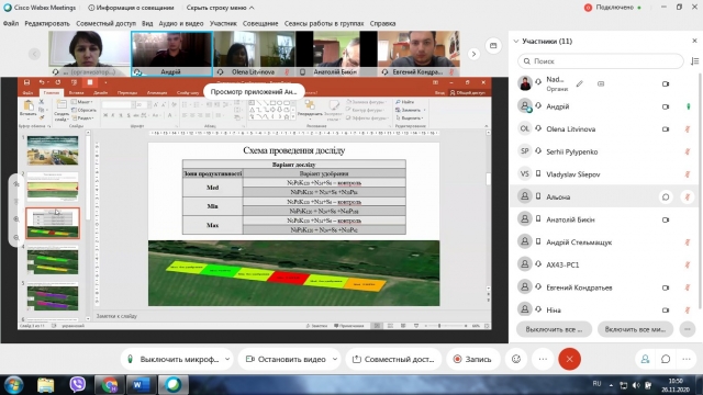 26 листопада кафедрі агрохімії та якості продукції рослинництва відбулася конференція і постерна презентація досліджень студентів денної форми, які готуються вже за два тижні захищати магістерські роботи. У заході взяли участь усі студенти магістратури двох освітньо-професійних програм – «Агрохімсервіс у прецизійному агровиробництві» і «Агрохімія і ґрунтознавство», які виконують дипломні роботи на кафедрі. Презентація пройшла у онлайн-режимі, за допомогою платформи Cisco Webex.