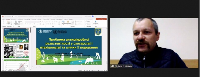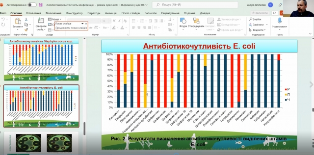 Про проблему антимікробної резистентності у скотарстві і птахівництві світовий та фармакології, паразитології і тропічної ветеринарії, НУБіП України Вадим Іщенко. Слухачі мали можливість ознайомитися із результатами досліджень УЛЯБ АПК з вивчення стійкості до різних груп протимікробних препаратів E.coli та Staphylococcus ssp., виділених із харчових продуктів.