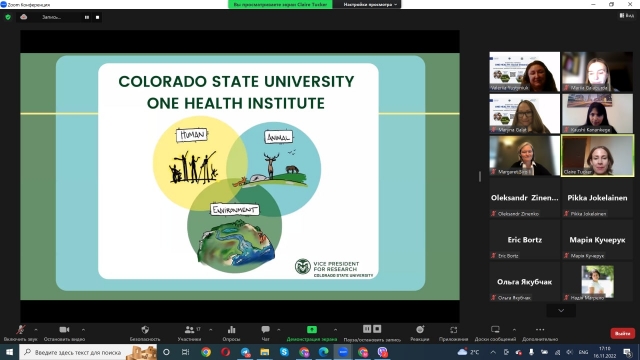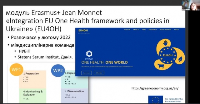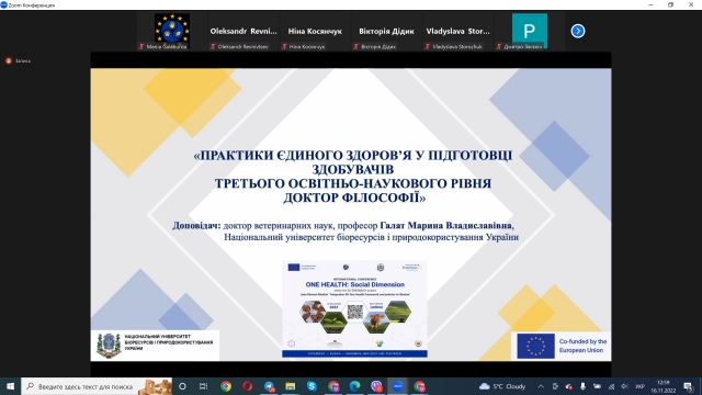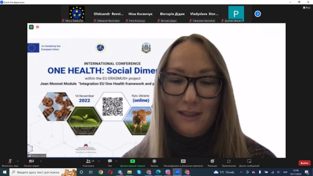 16 листопада 2022 року відбулася Міжнародна конференція «Єдине здоров’я: соціальний вимір» Захід здійснювався в рамках реалізації проєкту Європейського Союзу Еразмус+ напряму Жана Моне – “Інтеграція політики та засад Єдиного здоров’я ЄС в Україні” (101048229 — EU4OH — ERASMUS-JMO-2021-HEI-TCH-RSCH)”. Ця подія відбулася із урахуванням викликів сьогодення та завдяки належній стратегії розвитку університету щодо можливості дистанційного навчання, яка реалізувалася у попередні роки, та відповідної підтримки керівництва університету та факультетів ветеринарної медицини, а саме ректора Станіслава Ніколаєнка, проректора з науково-педагогічної роботи, міжнародної діяльності та розвитку Вадима Ткачука, директора ННЦ міжнародної діяльності Олександра Лабенка, начальника НДЧ Володимира Отченашко, декана факультету ветеринарної медицини Миколи Цвіліховського. Окрема подяка декану факультету інформаційних технологій Олені Глазуновій та професору Олені Кузмінській за технічний, інформаційний та консультаційний супровід даного заходу, що був реалізований із використанням корпоративного аккаунту Zoom. У роботі Міжнародної конференції, окрім представників Національного університету біоресурсів і природокористування України, взяли участь представник Всесвітньої організації охорони здоров’я тварин (Париж, Франція), міжнародні та національні експерти з питань єдиного здоров’я, продовольчої безпеки, зокрема, Офісу ВООЗ в Україні, Продовольчої та сільськогосподарської організації Об’єднаних Націй (ФАО ООН), Університету Аляски в Анкоріджі, Центру здоров’я тварин і безпеки харчових продуктів Університету Міннесоти, ХНУ ім. В. Н. Каразіна, Державного інституту серологічних досліджень Даніі в Копенгагені, Проекту ЄС з Єдиного здоров’я, Інституту Єдиного Здоров'я Університету штату Колорадо Української лабораторії якості та безпеки продукції АПК, науково-дослідних інститутів та вищих навчальних закладів України. Загалом слухачами заходу стало понад 170 осіб. Учасників конференції привітали Микола Цвіліховський, декан факультету ветеринарної медицини доктор біологічних наук, професор, академік НААН України та Володимир Отченашко, начальник науково-дослідної частини, д-р с.-г. наук, доцент НУБіП України.