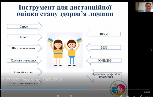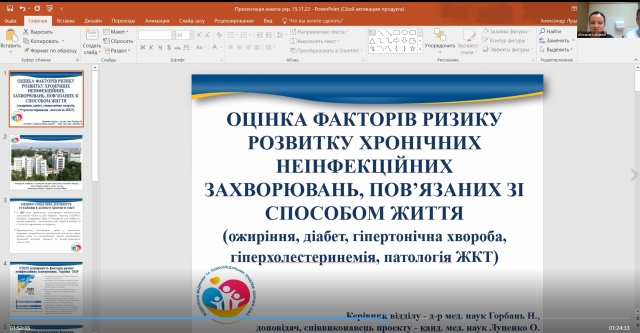 Колеги з Інституту педіатрії, акушерства і гінекології імені академіка О.М. Лук'янової Національної академії медичних наук України д.м.н., завідувач відділу медико-психосоціальних проблем здоров’я сім’ї Горбань Наталія та к.м.н., лікар загальної практики, науковий співробітник цього ж відділу Олександр Луценко розповіли учасникам про діяльність закладу для забезпечення громадського здоров’я та вивчення і оцінки факторів ризику хронічних неінфекційних захворювань, пов’язаних зі способом життя та представили, розроблений інструмент для скринінгу медичних та соціальних факторів ризику розвитку хвороб цивілізації.