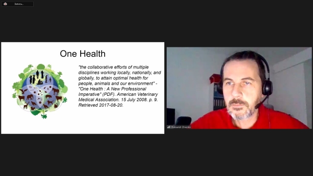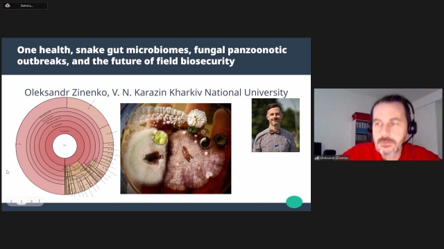 Доповідь “Єдине здоров’я, мікробіоми кишківника змії, спалахи грибкових панзоонозів і майбутнє біозахисту при роботі в польових умовах”, яку представив Олександр Зіненко, к.біол.н., провідний науковий співробітник Музею природи, доцент кафедри мікології та фітоімунології, ХНУ ім. В. Н. Каразіна викликала неабиякий інтерес у учасників конференції, оскільки висвітлювала особливості вивчення аспектів дикої фауни, які є невід’ємним компонентом Єдиного здоров’я.
