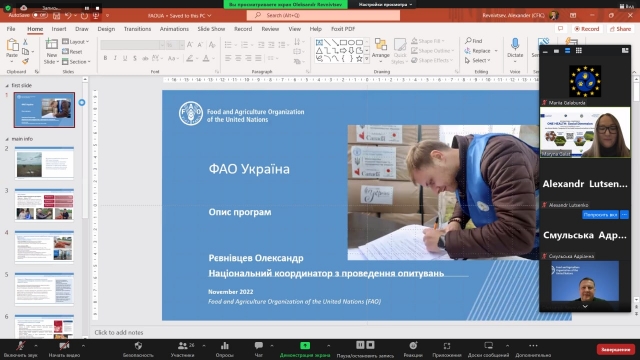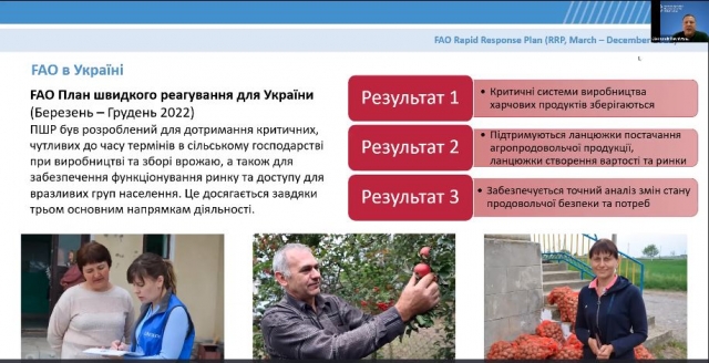 Національний координатор з проведення досліджень ФАО ООН, експерт зі здоров’я сільськогосподарських тварин та транскордонних захворювань Продовольчої та сільськогосподарської організації Об’єднаних Націй (ФАО ООН), лікар ветеринарної медицини Олександр Ревнівцев висвітлив результати діяльності ФАО в Україні для гарантування продовольчої безпеки та забезпечення здоров’я населення та тварин, зокрема, після початку війни ФАО розробила та оновила свій План швидкого реагування для надання підтримки жителям сільської місцевості через надання сільськогосподарської допомоги та забезпечення продовольчої безпеки для тих, хто найбільше постраждав внаслідок війни.