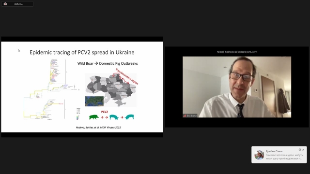 Доцент кафедри біологічних наук Університету Аляски в Анкоріджі, США, Ерік Борц, який також є запрошеним професором Інституту ветеринарної медицини НААН України, представив результати порівняльних досліджень геному вірусів АЧС, цирковірусної інфекції 2 типу ускладнених супровідною інфекцією, які були отримані в США та Україні в доповіді на тему: “Переваги геномного секвенування вірусів свиней в Україні: АЧС, PCV2 та ко-інфекції”.