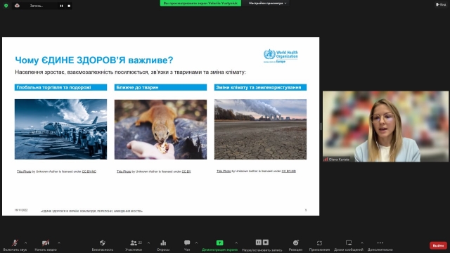 Про напрями діяльності ВООЗ в Україні для реалізації підходу Єдиного здоров’я слухачі мали можливість дізнатися із доповіді “Єдине здоров’я в Україні: взаємодія, перешкоди, наведення мостів” Олени Куряти, консультанта з Єдиного Здоров’я Офісу ВООЗ в Україні.