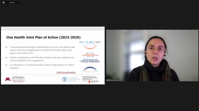 Заступник директора Центру здоров’я тварин і безпеки харчових продуктів Університету Міннесоти Сол Перес доповіла про розвиток потенціалу ветеринарних служб через призму Єдиного Здоров’я та досвід участі США та Центру Університету Міннесоти в забезпеченні таких дій.