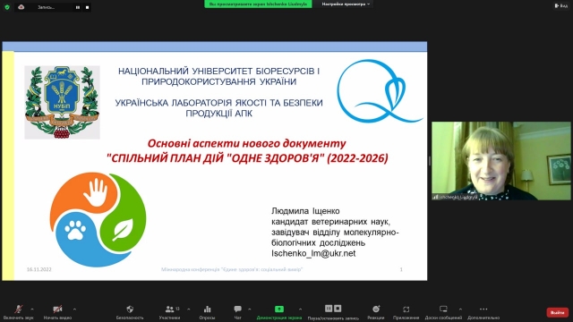 Основні аспекти нового документу «Спільного плану дій з Єдиного здоров'я (2022-2026)» та представила напрямки діяльності Української лабораторії якості і безпеки АПК були представлені завідувачем науково-дослідного відділу молекулярно-біологічних досліджень УЛЯБ АПК, кандидатом ветеринарних наук Людмилою Іщенко.