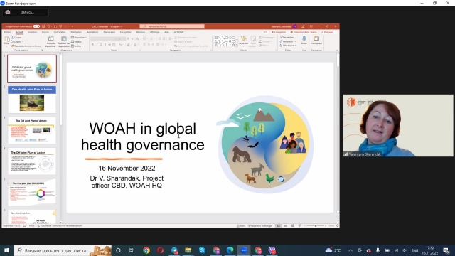 Валентина Шарандак, кандидат ветеринарних наук, уповноважена відділу розбудови потенціалу ВОЗТ доповіла про Роль Всесвітньої організації охорони здоров’я тварин в управлінні глобальним здоров'ям та розбудові потенціалу ветеринарних служб задля Єдиного здоров’я.