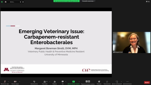 Доповідь лікаря ветеринарної медицини, Магістр громадського здоров’я, резидент програми з ветеринарного громадського здоров’я, Університет Міннесоти Маргарет Сіроллі висвітлювала результати досліджень карбапенем-резистентних Enterobactereales, що є актуальною проблемою у ветеринарії, оскільки Карбапенеми являють собою клас β-лактамних антибіотиків з широким спектром антибактеріальної активності. Карбапенеми є одними з антибіотиків останньої інстанції для багатьох бактеріальних інфекцій, таких як кишкова паличка (E. coli) і Klebsiella pneumoniae. Останнім часом, викликають тривогу поширення лікарської стійкості до антибіотиків карбапенемового ряду серед цих коліформних бактерій.В даний час немає нових антибіотиків на конвеєрі для боротьби з бактеріями, стійкими до карбапенемаів, і в усьому світі поширення гена резистентності розглядається як потенційний сценарій кошмару. Ці препарати мають широкий спектр антибактеріальної дії у порівнянні з іншими β-лактамними антибіотиками, такими як пеніциліни і цефалоспорини. Крім того, вони, як правило, стійкі до типових бактеріальних β-лактамаз, яка є одним з основних β-лактамних механізмів резистентності бактерій. Тим не менш, карбапенемам штамів стійких бактерій кишкової групи були ізольовані у Сполучених Штатах.