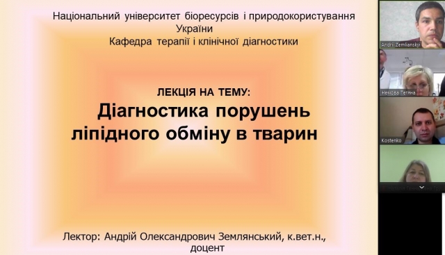17 травня 2023 року доцент кафедри терапії і клінічної діагностики, кандидат ветеринарних наук, Землянський Андрій Олександрович провів відкриту лекцію з дисципліни «Клінічна діагностика хвороб тварин» для студентів 3 курсу ОС «Магістр» спеціальність 211 «Ветеринарна медицина». Тема: «Діагностика порушень ліпідного обміну в тварин». Лекція відбулась в дистанційному форматі на платформі ZOOM. Андрій Землянський разом із студентами розглянули основні відомості щодо діагностики порушень обміну речовин. Визначено поняття, що належать до патології обміну ліпідів у тварин, висвітлено діагностику порушення ліпідного обміну, розглянуто клінічні випадки. Впродовж заняття студенти із зацікавленістю сприймали матеріал і задавали питання. За результатами лекції проведено анкетування присутніх на лекції здобувачів та НПП щодо якості лекційного заняття. На завершенні, викладачі обговорили прослухану лекцію і відзначили високий науково-методичний рівень викладення матеріалу.