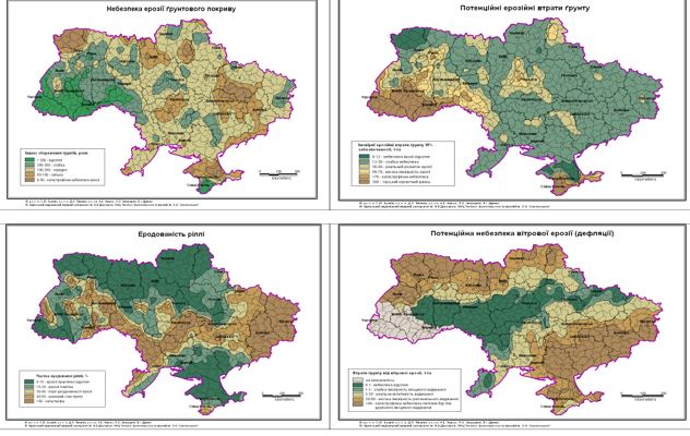В лекційному матеріалі були використані оригінальні карти, складені проф. Булигіним С.Ю. та співавт., які дозволяють наочно оцінити реальні і потенційні втрати ґрунтового вкриття від найбільш небезпечних видів деградацій – водної і вітрової ерозії.