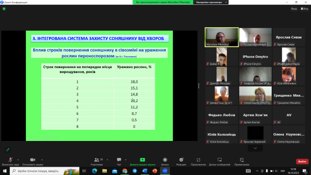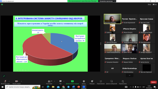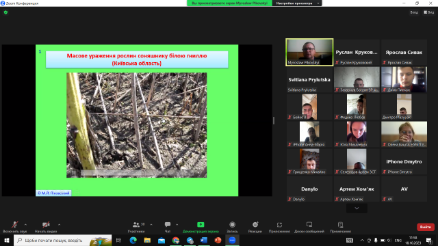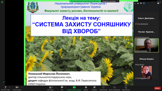 18 жовтня 2023 року Мирослав Піковський, доктор с-г. наук, доцент кафедри фітопатології ім. акад. В.Ф. Пересипкіна провів відкриту лекцію з дисципліни «Сільськогосподарська фітопатологія» на тему: «Система захисту соняшнику від хвороб» для студентів ІV курсу факультету захисту рослин, біотехнології та екології, спеціальності 202 «Захист і карантин рослин». На лекції також були присутні науково-педагогічні працівники факультету.