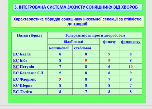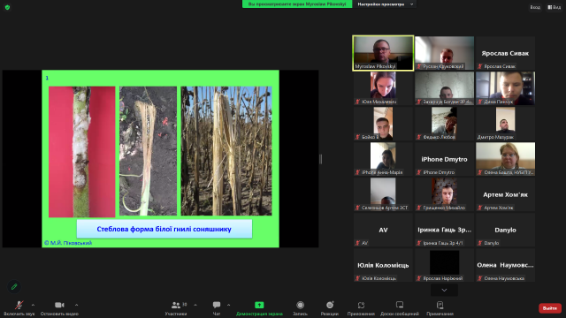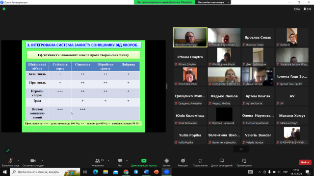 У процесі лекції було розкрити питання ареалів шкідливості хвороб соняшнику, впливу біотичних і абіотичних факторів середовища на розвиток патогенів і хвороб та акцентовано увагу на систему заходів захисту. При цьому відмічено, що найкращою стратегією контролю хвороб соняшнику є інтеграція різних методів і способів, які ґрунтуються на збалансованій агротехніці, використанні здорового насіннєвого матеріалу, імунологічному, біологічному та хімічному методах захисту рослин. Студенти прийняли активну участь у дискусії стосовно ефективності різних заходів проти хвороб і шляхів зменшення ураження рослин соняшнику патогенами, які в сучасних сівозмінах мають спільних збудників із ріпаком і соєю.