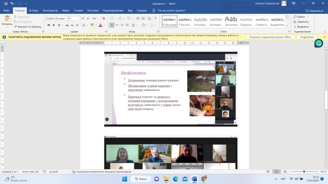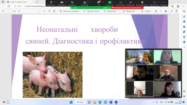 13 березня 2023 року завідувач кафедри терапії і клінічної діагностики, доктор ветеринарних наук, доцент Грушанська Наталія Геннадіївна провела відкриту лекцію з дисципліни «Ветеринарні превентивні технології незаразних хвороб свиней» для студентів 6 курсу ОС «Магістр» спеціальність 211 «Ветеринарна медицина». Розглянуто тему: «Неонатальні хвороби свиней. Діагностика і профілактика». Лекція відбулась в дистанційному форматі на платформі ZOOM.