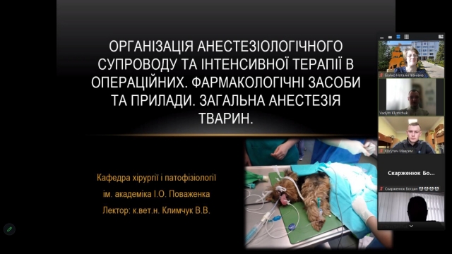 Вадим Климчук разом зі студентами розглянув основні підходи до провадження анестезіологічного супроводу за виконання оперативних втручань та інвазивних методів діагностики у різних видів тварин. Розглянуто сучасні підходи до обрання виду загальної анестезії в залежності від стану пацієнта та необхідного рівня анестезії а аналгезії; необхідне матеріальне та інструментальне забезпечення інтраопераційного моніторингу пацієнта та провадження певного виду загальної анестезії у тварин. Впродовж заняття студенти із зацікавленістю сприймали матеріал.
