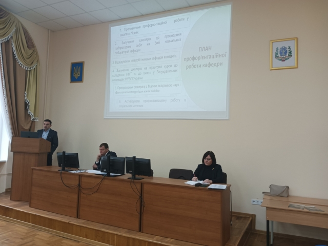 До уваги присутніх була доведена інформація кафедр аналітичної і біонерганічної хімії та якості води та загальної, органічної та фізичної хімії завідувачі Тетяна Ущапівська та Андрій Галстян проінформували присутніх про кількість договорів про співпрацю з навчальними закладами, участь НПП у заходах, що проводяться у школах, а також про кількість абітурієнтів залучених на підготовчі курси і олімпіаду, акцентували важливість зворотного зв’язку з школярами та популяризацію інформації у соціальних мережах.
