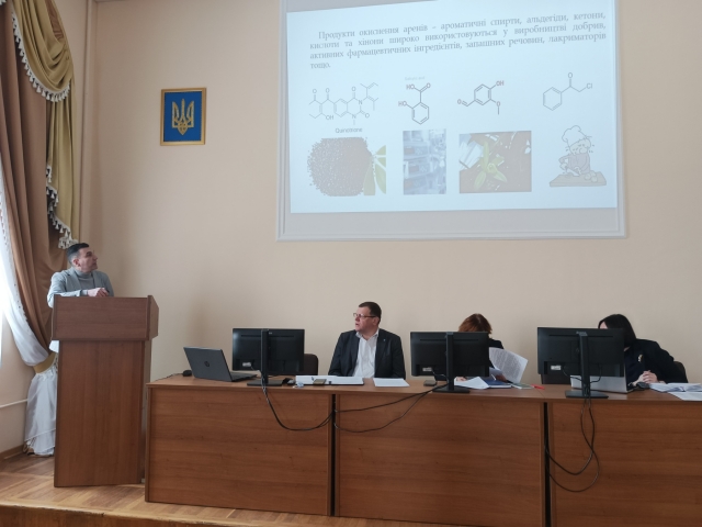 Наукова доповідь була представлена доктором х.-н. наук, професором Андрієм Галстяном на тему «Перспективи озонних технологій у виробництві біологічно активних речовин». Доповідач розповів про перспективи застосування озонових технологій шляхом створення синтезу цілого ряду бензойних кислот. Нова система передбачає використання розчинника і каталізатора основним продуктом синтезу є бензилові спирти. Практичне значення в агрономії використання синтезу озонових сполук – виготовлення пестицидів, виділення розробка гумінових речовин і добрив.