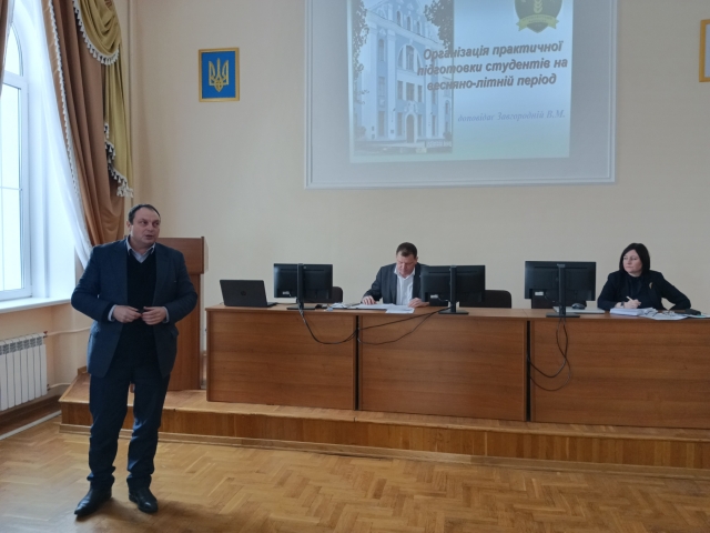 Заступник декана Володимир Завгородній охарактеризував структуру практичної підготовки в основний термін навчання, оновлення робочих програм на сайтах кафедр. Запропонував розпланувати практичну підготовку врівноважено відповідно базам практик, а також ознайомив із графіком проходження навчальних практик. Окрема увага була приділена проведенню виробничої практики, своєчасне подання договорів та локаційного розміщення баз практик.