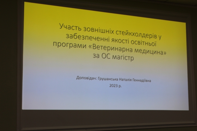 Гарант освітньої програми «Ветеринарна медицина» Наталія Грушанська у своєму виступі зосередила увагу учасників засідання на активній участі зовнішніх стейкхолдерів (випускників і роботодавців) у забезпеченні якості освіти за цією освітньою програмою. Зокрема, її рецензуванні, участі в обговоренні під час розроблення та оновлення програми, викладанні курсів дисциплін, гостьових лекціях, проведенні майстер-класів, наданні баз і керівництво виробничою практикою.