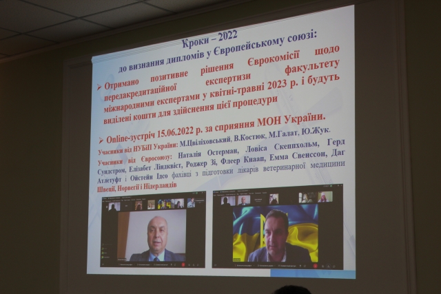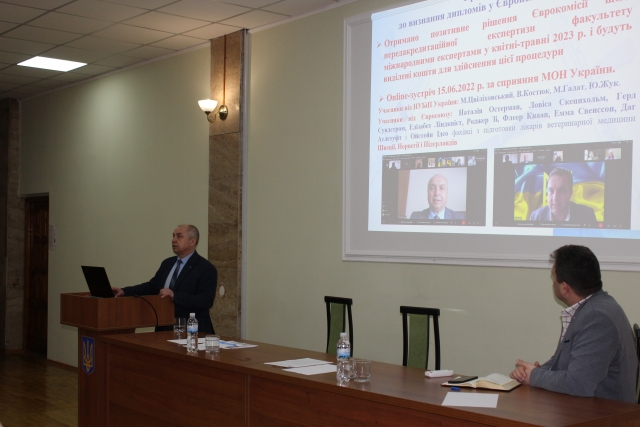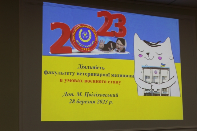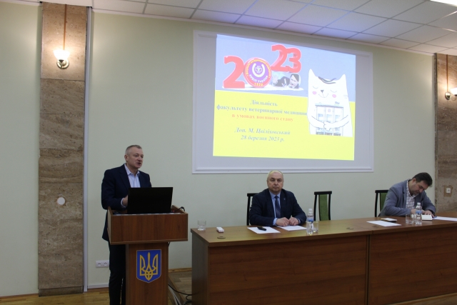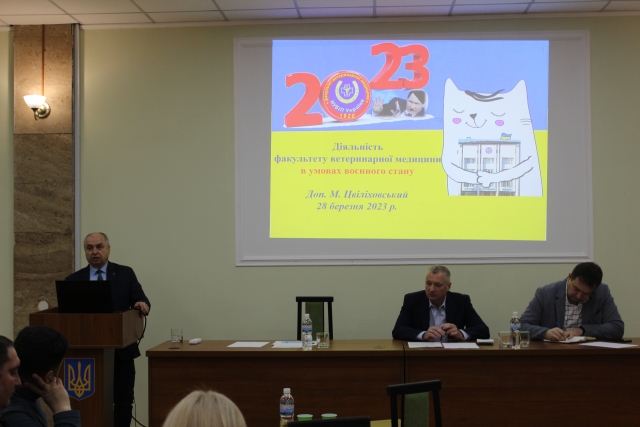 Декан факультету Микола Цвіліховський у своїй доповіді «Діяльність факультету ветеринарної медицини в умовах воєнного стану» зупинився на питаннях підготовки лікаря ветеринарної медицини в умовах воєнного стану і викликах, які супроводжують галузь «Ветеринарія». Він відзначив, що підготовка висококваліфікованого фахівця з ветеринарної медицини, забезпечення його знань, умінь і компетентностей – можлива лише за умови очного навчання. Одним із викликів сьогодення є заключна атестація здобувачів вищої освіти із складанням ними Єдиного державного кваліфікаційного іспиту (ЄДКІ).