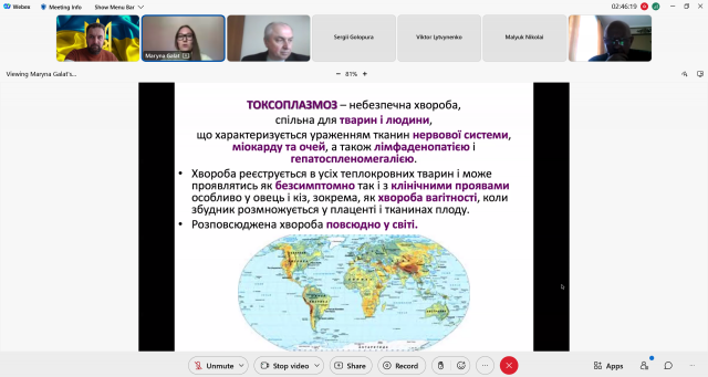 З науковою доповіддю «Токсоплазмоз тварин, поширення в Українi та небезпека зараження людини» виступила доктор ветеринарних наук, професор кафедри фармакології, паразитології і тропічної ветеринарії Марина Галат. Доповідь викликала жваву дискусію. В її обговоренні взяли участь Микола Цвіліховський, Володимир Духницький, Наталія Сорока, Віталій Недосєков, Володимир Костюк, Дмитро Засєкін та інші.