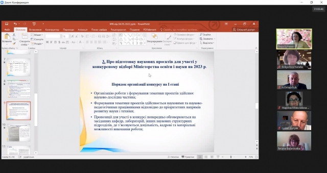 Бутенко В.М. проінформувала про підготовку наукових проєктів для участі у конкурсному відборі Міністерства освіти і науки на 2023 р. Було наголошено на необхідності готувати наукові проєкти на актуальні для країни теми.