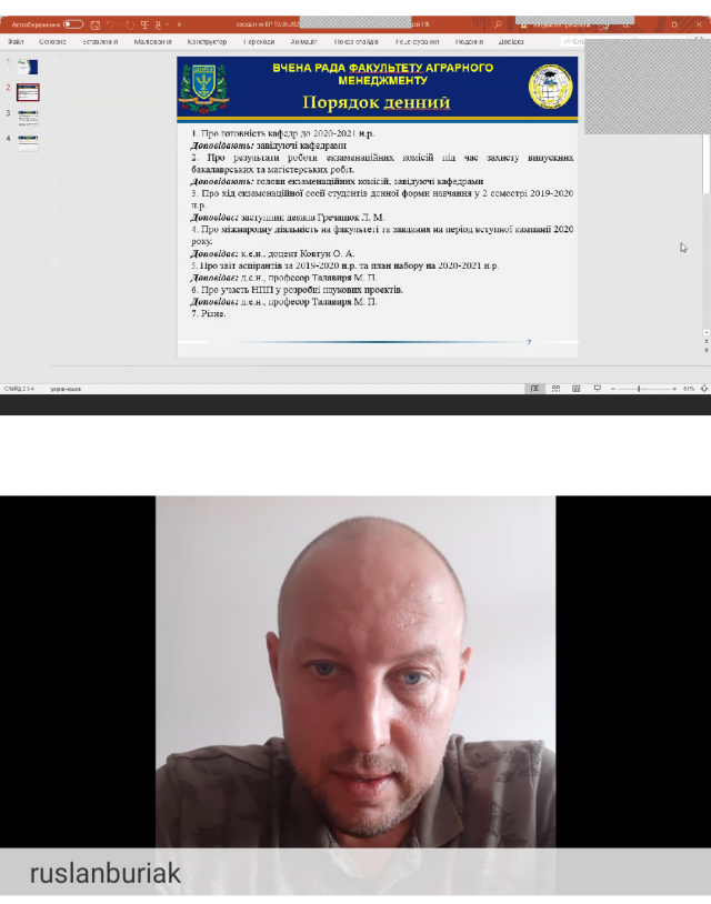 19 червня відбулося засідання вченої ради факультету аграрного менеджменту онлайн. З початком карантинних заходів на факультеті проведена велика кількість нарад у форматі онлайн і ефективність веб-нарад не відрізняється від звичного режиму. Відповідно до порядку денного завідувачі кафедр прозвітували про готовність ввірених підрозділів до 2020-2021 навчального року.