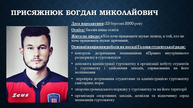 Богдан Присяжнюк у своєму виступі на загальних зборах мешканців гуртожитку розповів про основні напрямки роботи серед яких: контроль дотримання мешканцями «Правил внутрішнього розпорядку в гуртожитку», охорона громадського порядку, організація спортивних заходів, дозвілля та відпочинку серед мешканців гуртожитку.