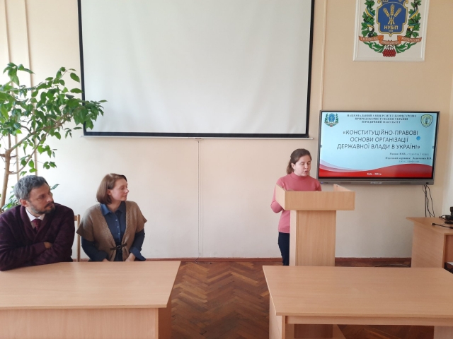 2) студентку 1 року навчання магістратури Шевченко Катерину Сергіївну з науковою роботою на тему: «Зародження української націології в працях О. Бочковського та В. Старосольського». Студентський науковий гурток «Дискусійний клуб «De Jure!» ( науковий керівник – доц. Протосавіцька Л.С) 90 балів;