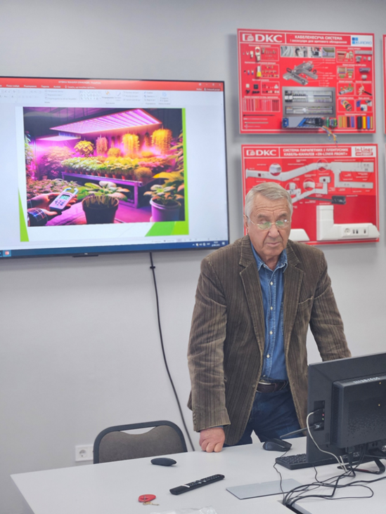 Професор Леонід ЧЕРВІНСЬКИЙ у своїй доповіді «Перспективи оптичних технологій для агропромислового виробництва» поділився практичним досвідом проведення дисертаційних досліджень своїх аспірантів. У своєму виступі розкрив революційний потенціал науки, наголошуючи на важливості міждисциплінарного підходу. Особливу увагу він приділив ролі біологічних досліджень у забезпеченні продовольчої безпеки та сталого розвитку, зокрема, новим напрямкам в сільському господарстві: SMART освітлення та агровольтаїка, що об’єднує вироблення сонячної енергії і фермерство на одній і тій самій ділянці землі.