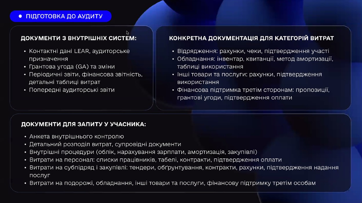 На практичному рівні підготовка передбачає перевірку всієї документації, доступної у внутрішніх системах та на порталі Funding & Tenders, зокрема, контактних даних LEAR, періодичних звітів, фінансових документів і супровідних матеріалів. Не менш важливо заздалегідь підготувати пакет документів, які можуть бути запитані аудитором: