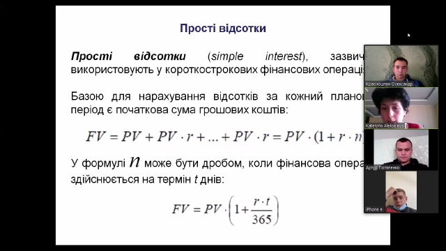 Катерина Андріївна спочатку надала загальний теоретичний матеріал за допомогою демонстрації презентації через ZOOM, а також було роз’яснено поняття вартості грошової одиниці в часі та такий необхідний для інвестиційних менеджерів інструмент як дисконтування, надані формули для розв’язання задач зі зразками розв’язків. Подібні задачі мають протягом наступного тижня бути розв’язаними та завантаженими як практичні завдання на сторінку курсу навчально-інформаційного порталу Elearn.