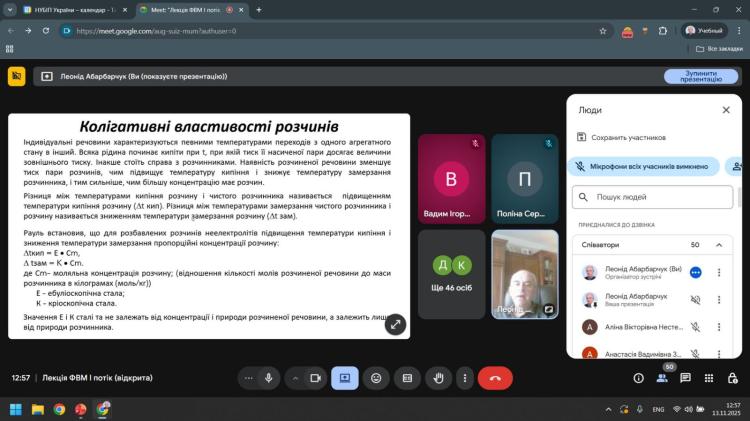 Темою лекції була «Хімічна рівновага. Колігативні властивості розчинів». Викладач ґрунтовно розкрив основні закономірності зміщення хімічної рівноваги, зокрема принцип Ле Шателье, та продемонстрував приклади з реальних хіміко-біологічних систем, що мають значення для ветеринарної практики. Особливу увагу було приділено колігативним властивостям розчинів - підвищенню температури кипіння, зниженню температури замерзання та осмотичному тиску.