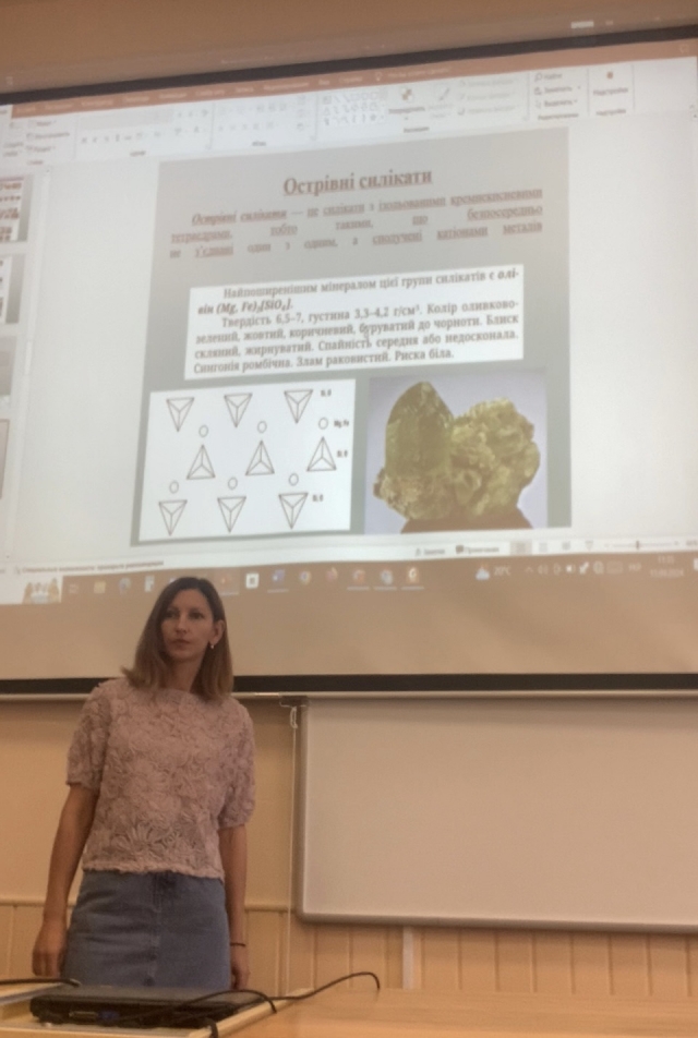 Під час лекції Лариса Кучер детально виклала фізичні властивості мінералів. Жваве обговорення і зацікавленість у студентів викликали причини кольорів мінералів. Було детально розглянуто хімічну класифікацію мінералів.