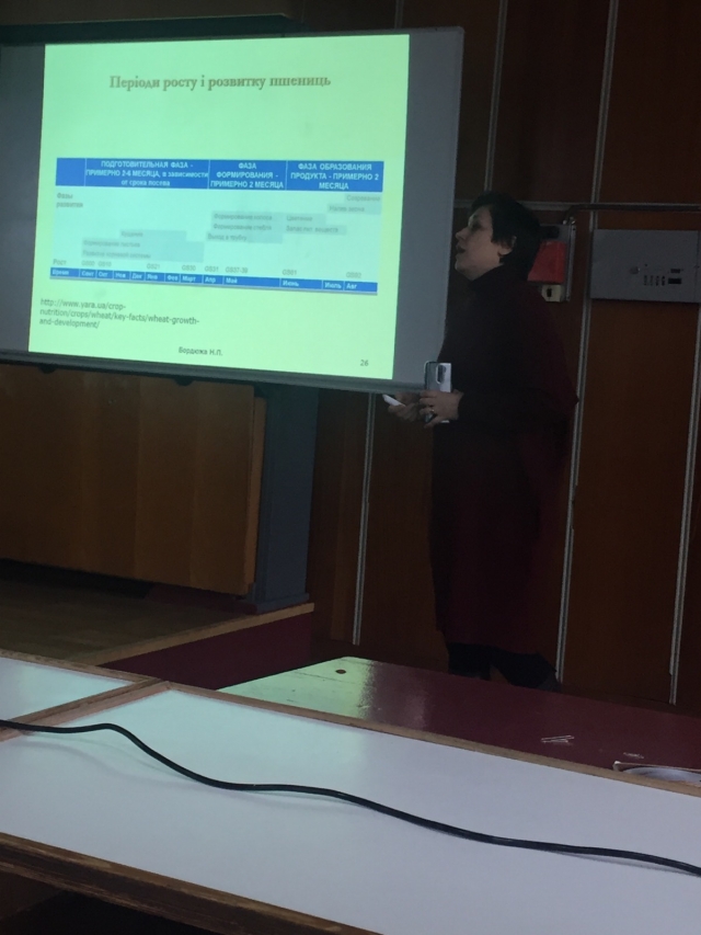 Протягом лекції лектор звернула увагу студентів на позиції України на ринку виробництва зерна пшениці за останніми даними ФАО, вплив різноманітних чинників на формування вмісту білка і клейковини у зерні протягом вегетації рослин. Особливу увагу приділила умовам живлення рослин, способам їх регулювання, зокрема застосування добрив пролонгованої дії, інгібіторів уреази та нітрифікації. Окрему роль відвела особливостям діагностики живлення рослин пшениці. На закінчення, було продемонстроване відео про концепцію 4-х правил застосування добрив Міжнародного інституту живлення рослин.