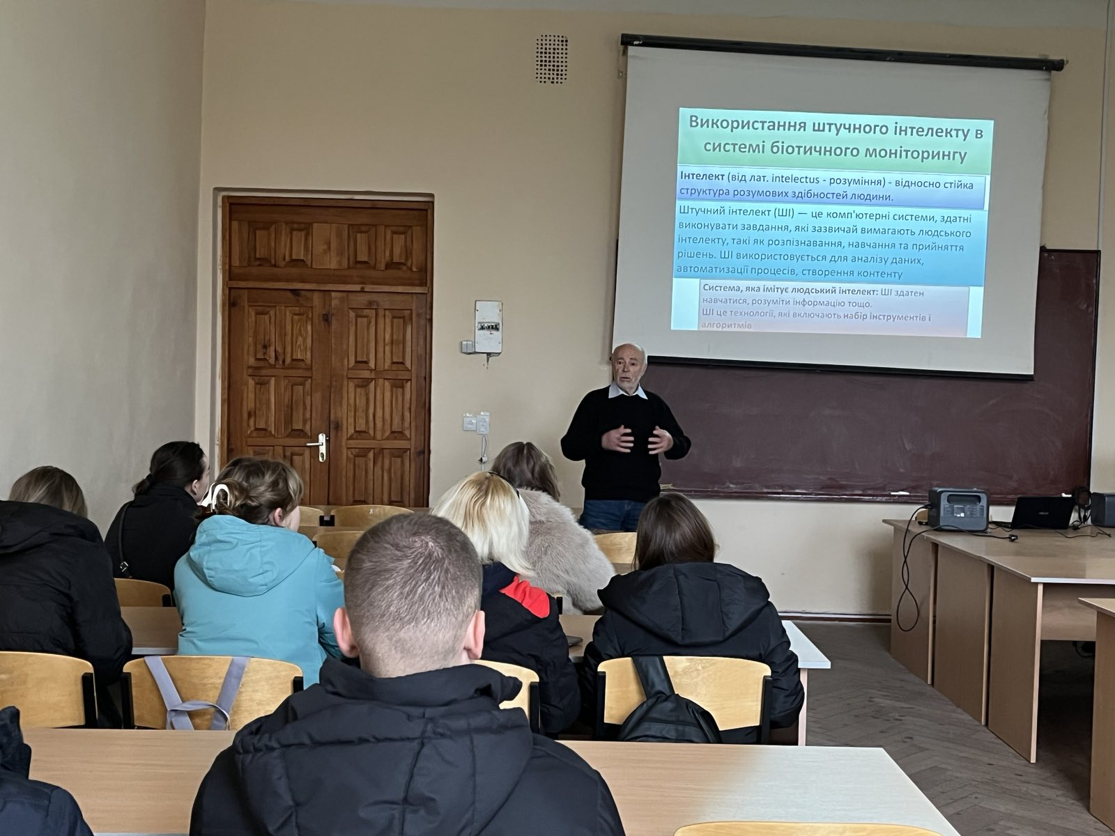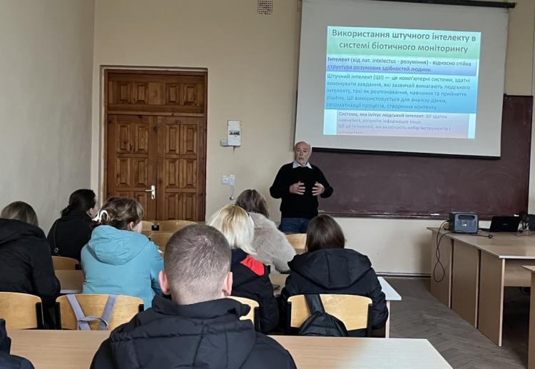 Актуальна на сьогодні тематика щодо використання можливостей штучного інтелекту (ШІ), зокрема, в навчальному процесі викликала жвавий інтерес серед студентів і викладачів. Незважаючи на відсутність електропостачання лекція відбулась в повному форматі. Професор доступно пояснив можливості і перспективи використання ШІ при моніторингових дослідженнях біологічного різноманіття в природних і штучних екосистемах.