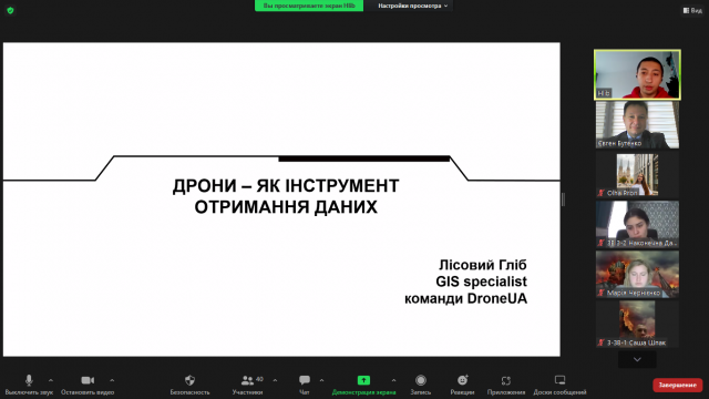 Гліб розповів про дрони, як інструмент отримання данних, про підготовку перед початком знімання та про різні складності проведення зйомок. Студенти дізнались багато нової та цікавої інформації починаючи з типів носіїв дронів, їх види, задачі, які ставляться для виконаття і побачили приклади готового знімання місцевості.