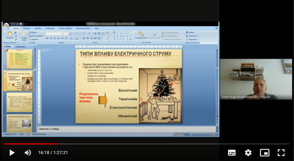 Лекція відбувалася в онлайн-режимі з використанням інтерактивних технологій викладання матеріалу, що дало змогу студентам повноцінно зрозуміти викладений матеріал лекції. В лекції студенти вивчили розглянули аналіз і причини виробничого електротравматизму в електроенергетичній галузі, вивчили питання дії електричного струму на людину внаслідок ураження електричним струмом, фактори, що впливають на наслідки ураження людини електричним струмом та критерії, що визначають електробезпеку на виробництві.