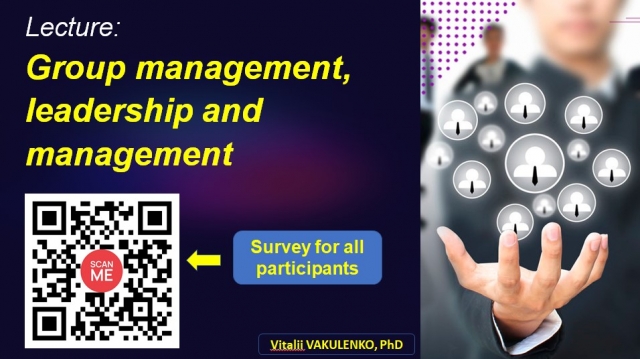 Відповідно до затвердженого графіку проведення відкритих лекцій у Національному університеті біоресурсів і природокористування України, 25 жовтня 2024 року  кандидат економічних наук доцент кафедри менеджменту ім. проф. Й. С. Завадського Вакуленко Віталій Леонідович провів англійською мовою відкриту лекцію з дисципліни "Management" на тему "Group management, leadership and management" для здобувачів 2 курсу першого (бакалаврського) рівня вищої освіти спеціальності 073 «Менеджмент».