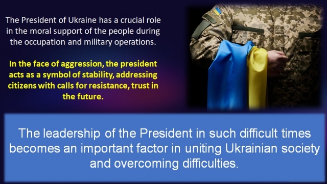 Лекція була присвячена розгляду основних понять лідерства та менеджменту, лідера та менеджера, їх спільних і відмінних рис. Саме тому першочерговим завданням зустрічі зі студентами та запрошеними гостями стало всебічне обговорення ролі Президента України у зміцненні морального духу населення в умовах окупації та активних воєнних дій. Особливу увагу було приділено основним функціям Гаранта держави з метою забезпечення національної стабільності та єдності, який через звернення до громадян, закликає до стійкості, непохитної віри в перемогу та впевненості в майбутньому країни.