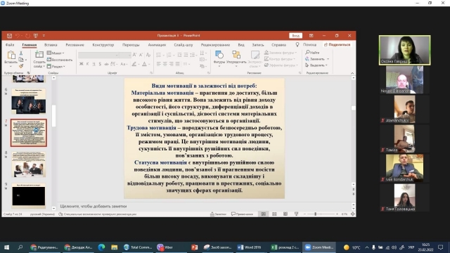 23 лютого 2022 р. відбулася відкрита лекція кандидата економічних наук, доцента, доцента кафедри менеджменту ім. проф. Й. С. Завадського Гавриш Оксани Миколаївни з дисципліни «Мотиваційний менеджмент» на тему «Характеристика основних видів та методів мотивації» для здобувачів 4 курсу першого (бакалаврського) рівня вищої освіти факультету аграрного менеджменту.