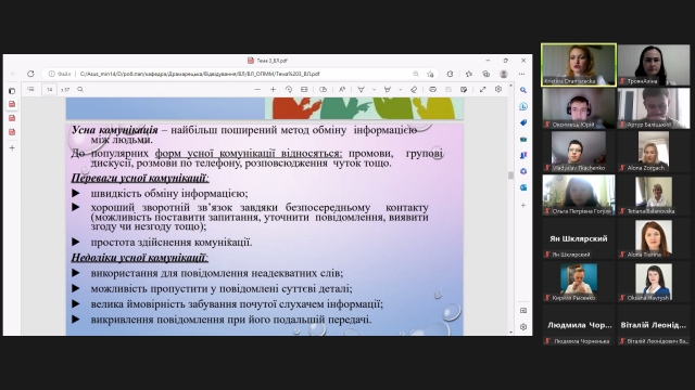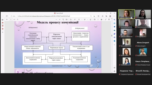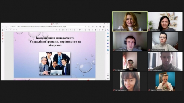 На початку лекції було чітко визначено тему та план лекції. Кристина Павлівна продемонструвала цікавий презентаційний матеріал, що дозволило змістовно висвітлити тему лекції та зацікавити здобувачів вищої освіти. Лектор розкрила поняття комунікаційного процесу, акцентувала увагу на особливостях міжособових та організаційних комунікацій, ознайомила студентів з поняттям груп в організації та з їх типами, сутністю керівництва та лідерства, пояснила як ці категорії співвідносяться між собою.