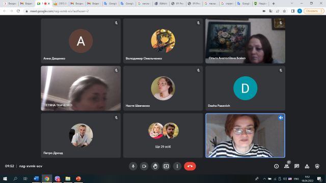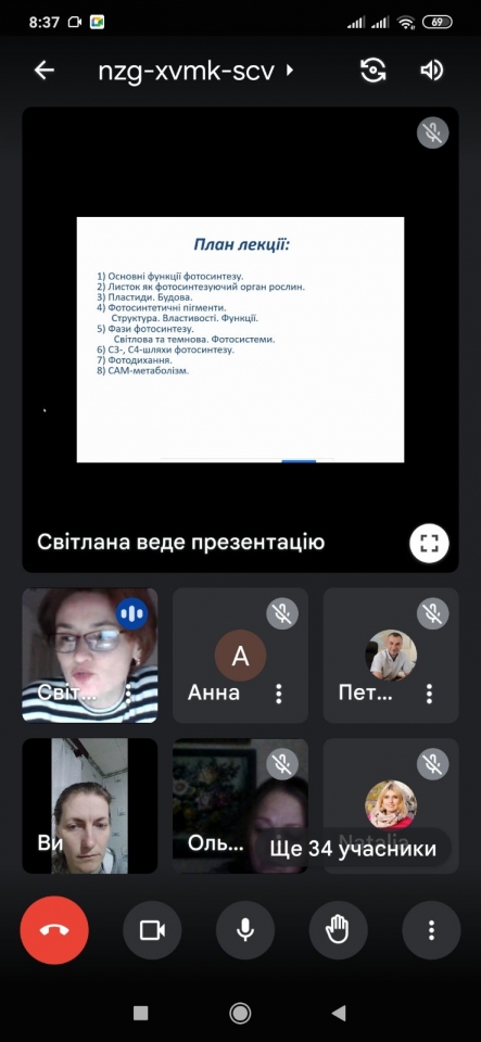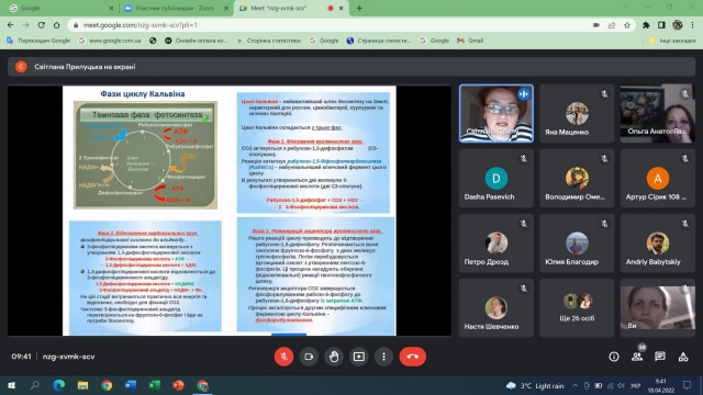 У понеділок, 18 квітня 2022р. завідувач кафедри фізіології, біохімії рослин та біоенергетики, д.б.н., с.н.с. Світлана Володимирівна Прилуцька провела відкриту лекцію для студентів ІІІ курсу ОС Бакалавр факультету Захисту рослин, біотехнологій та екології зі спеціальності 162 «Біотехнології та біоінженерія» з дисципліни «Фізіологія рослин» на тему «Фотосинтез». Лекція проходила онлайн, на платформі GoogleMeetings, на першій парі й розпочалася вчасно о 8 год 30 хв.