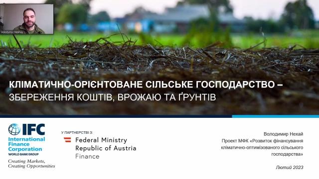 17 лютого в рамках проєкту «Агрокебети» відбулась відкрита онлайн-лекція на тему: “Основи кліматично-орієнтованого землеробства” від спеціаліста з агрономії та консультанта IFC з кліматично-орієнтованого землеробства Володимира Нехая. Володимир більше 15 років відпрацював в сфері продажу, оренди та обслуговування сільськогосподарської техніки. Має досвід в консалтингу з технологій для підвищення ефективності виробництва продукції рослинництва, точного землеробства та кліматично-орієнтованого землеробства.